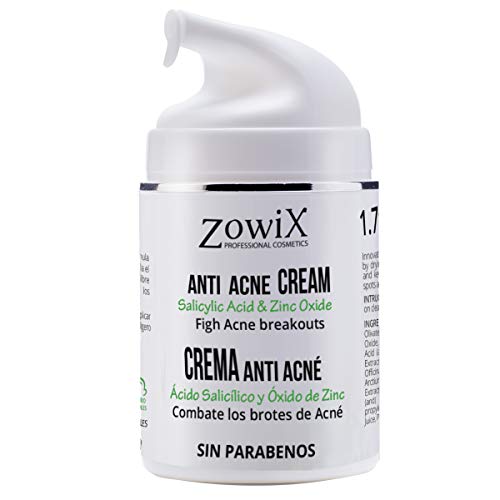 ZOWIX Crema anti acne. Elimina espinillas y granos. Tratamiento facial antiacné natural y efectivo con A. Salicílico y Oxido de Zinc. Todo tipo de acné. 50 ml