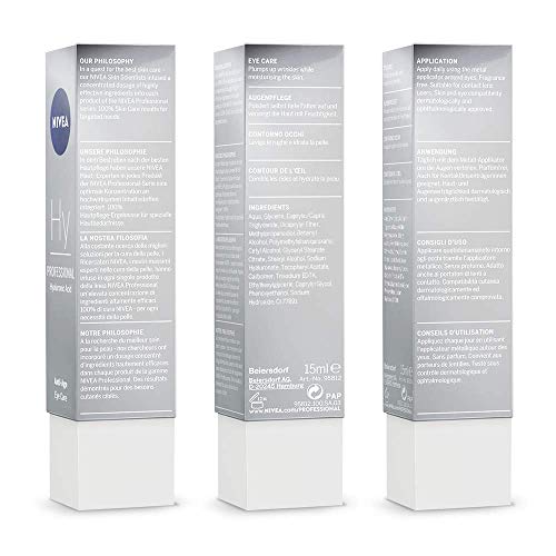 - CUIDADO EXCLUSIVO DE LA CARA CON UN DISEÑO MODERNO: La gama NIVEA PROFESSIONAL fue desarrollada para un uso exclusivamente profesional por expertos en la piel de NIVEA y no está disponible en las tiendas habituales. Esta crema para los ojos satisface las necesidades cambiantes de las pieles más exigentes y viene en un práctico dosificador de 15 ml. Gracias al aplicador metálico, resulta muy sencillo aplicar la crema profesional directamente en la zona del contorno de ojos.