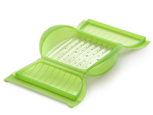 - Para cocinar alimentos al vapor con este hermético vaporera, vierta el agua en la base, añada el escurridor con la comida, cierre la tapa y abra la válvula en la parte superior. Cocine en el microondas unos minutos y su comida estará lista.