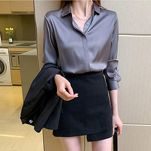X-xyA Blusa de satén de Seda para Mujer Nueva Primavera Suelta Manga Larga Camisa de satén,Gris,M