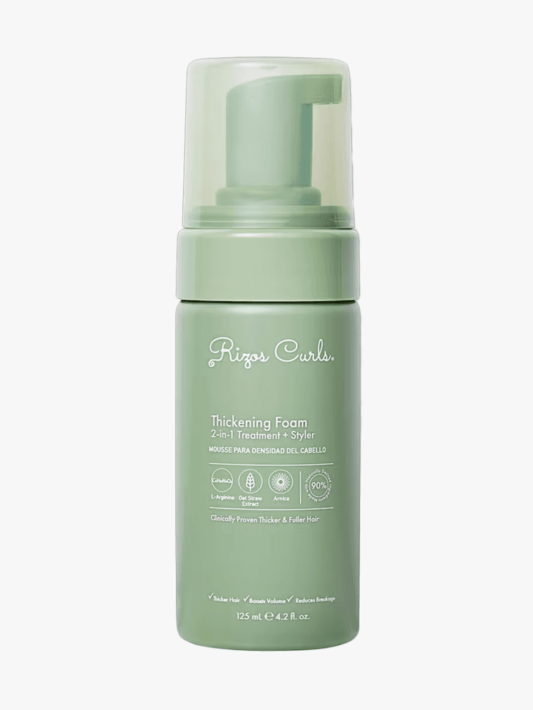 Por qué nos encanta: Para aquellos cuyo cabello necesita un poco de TLC, el Rizos Curls Thickening Treatment Foam ayuda a fortalecer hebras frágiles, aumentar el volumen, mejorar el brillo y reducir la rotura. El ingrediente estrella es la L-arginina, un aminoácido que se encuentra en la queratina, que ayuda a minimizar la pérdida de cabello al protegerlo de daños, reducir la rotura y apoyar la barrera de humedad del cabello. El extracto de avena también repara la elasticidad general del cabello. También vale la pena mencionar: Huele a menta con chispas de chocolate, lo cual le encantó a nuestro probador.
