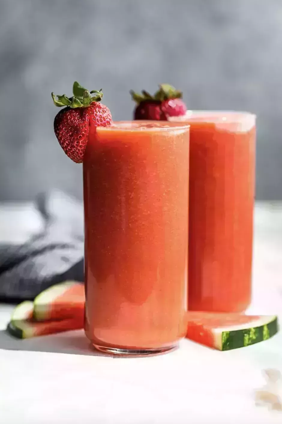 He aquí una nueva y divertida combinación que probablemente aún no hayas probado: fresa y sandía. Este batido es sencillo: Añade trozos de sandía, fresas, zumo de limón o lima y menta. Luego mézclalo para obtener tu nueva bebida favorita del verano.