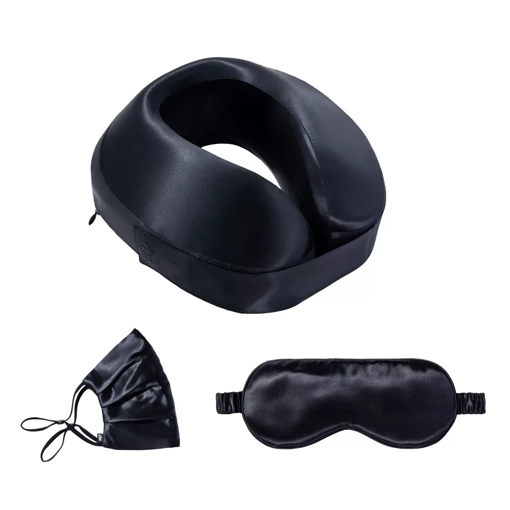 Este set te ayudará a descansar bien. Viene con una almohada para el cuello, una máscara para dormir y una máscara facial, todo hecho de seda lavable.