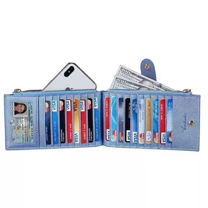 FurArt Si no le gusta cargar con una cartera enorme, le recomendamos esta opción súper delgada. Tiene capacidad para ocho tarjetas, una ventana para el DNI y un bolsillo para el dinero. La cartera también cuenta con una tecnología especial de bloqueo de RFID, para que no te roben la información de tu tarjeta de crédito cuando estés fuera de casa.