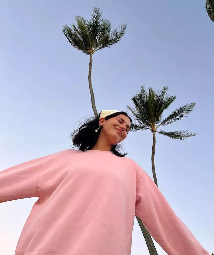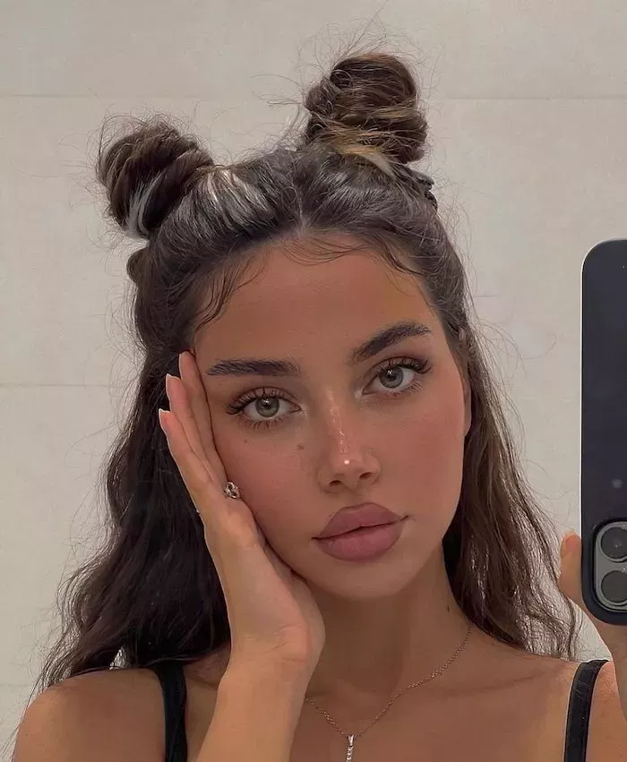 El doble half-up half-down es igual que el half-up half-down normal, pero con dos en lugar de uno. Para este look, puedes utilizar gomas transparentes. Simplemente separa tu pelo y ata dos trozos hacia atrás para conseguir los objetivos de Pinterest.