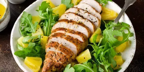 Cómo se hace: Saltea los trozos de pollo en cubos en una sartén engrasada hasta que se doren, unos 10 minutos. Mezcla el pollo cocido, los trozos de piña, las espinacas tiernas, los ramilletes de brócoli y las cebollas rojas en rodajas con un aderezo de vinagre balsámico.