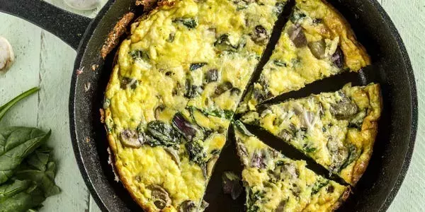 Cómo hacerla: En una sartén, vierte los huevos batidos sobre las verduras salteadas, como espinacas, cebollas, patatas y pimientos. Añade sal, pimienta, ajo, albahaca y queso mozzarella y cocina a fuego medio durante 2 o 3 minutos, luego asa durante unos 3 minutos.