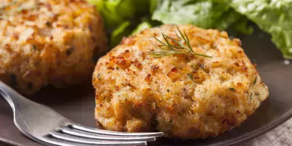 Cómo hacerla: Combine la carne de cangrejo con la mayonesa, las claras de huevo, la mostaza, el eneldo, el zumo de limón y el condimento para mariscos. Forme hamburguesas redondas con la mezcla y rebócelas con pan rallado integral. Hornéelas durante 20 minutos a 350 ºF, hasta que se doren.