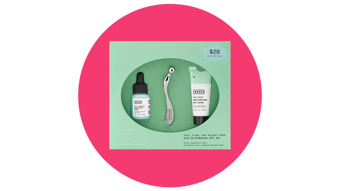 Este económico set incluye un sérum clarificador con extracto de corteza de sauce calmante y niacinamida iluminadora, una crema hidratante facial ligera y con efecto de rocío hecha con aloe calmante y té verde, y una varita de acupresión facial para realizar un masaje facial en cualquier momento.