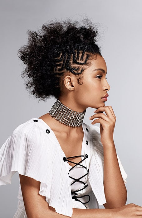 Para dar un buen aspecto, mantén las trenzas a un lado de la cabeza y deja que tus rizos naturales ocupen el centro de la escena, tanto en la parte superior como en la trasera.