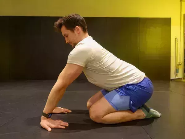 La movilidad de las muñecas también es importante, así que calienta antes de practicar poniéndote sobre las manos y las rodillas y moviendo las manos en diferentes posiciones en el suelo, como: palmas hacia abajo y dedos apuntando hacia fuera, palmas hacia arriba y dedos hacia fuera, y palmas hacia abajo y dedos apuntando a las rodillas. Mueve tu cuerpo para sentir un suave estiramiento.