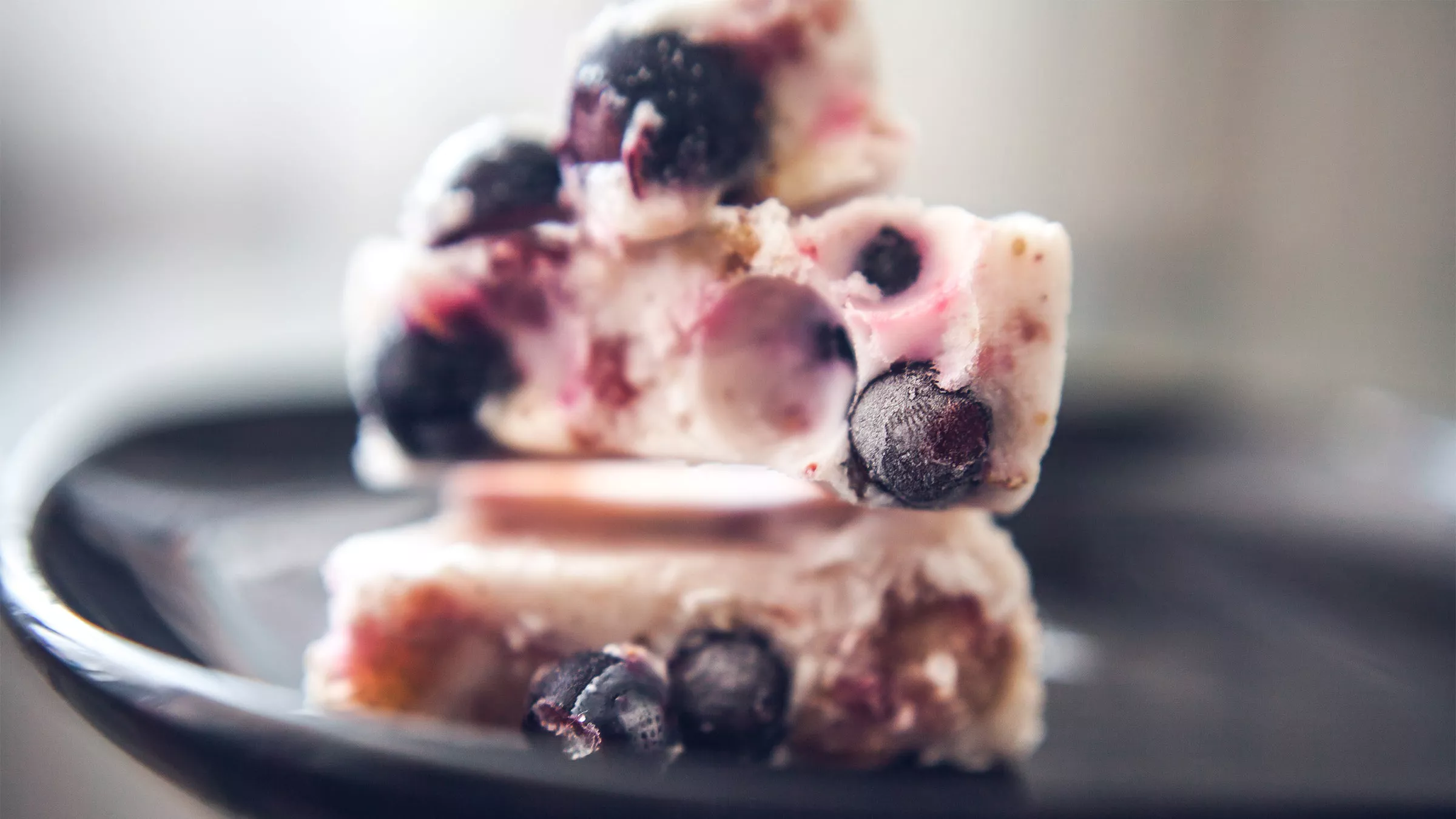 Yasso Black Raspberry Chip Greek Yogurt Bars Refresca tu día con este postre congelado sin gluten, que contiene solo 100 calorías y 5 gramos de proteína por barra.