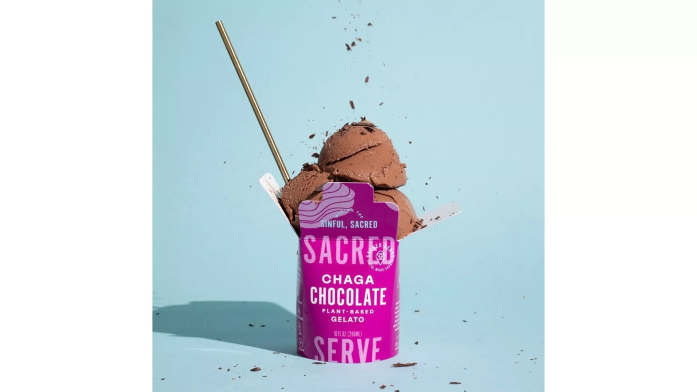 Sacred Serve Chaga Chocolate Gelato Este gelato a base de coco está elaborado con cacao crudo para elevar el ánimo, maca para incrementar energía y champiñones chaga para apoyar el sistema inmunológico.