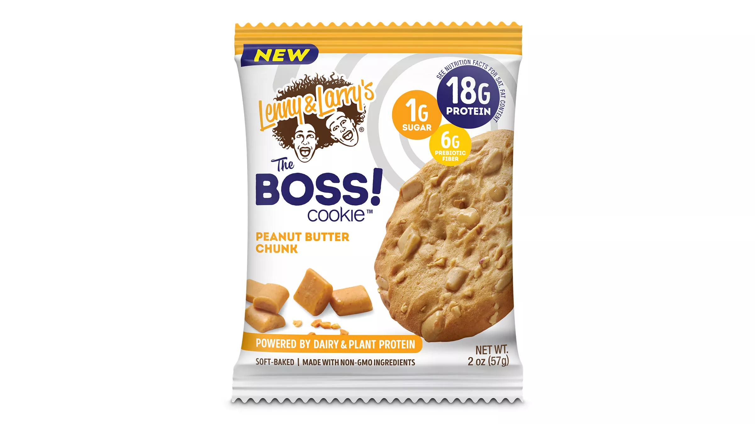 Lenny & Larry’s The Boss Cookie Peanut Butter Chunk Los cacahuetes y la proteína de leche de alta calidad convierten a esta galleta en una fuente de proteínas. Cada galleta tiene 18 gramos de proteína y solo 1 gramo de azúcar.