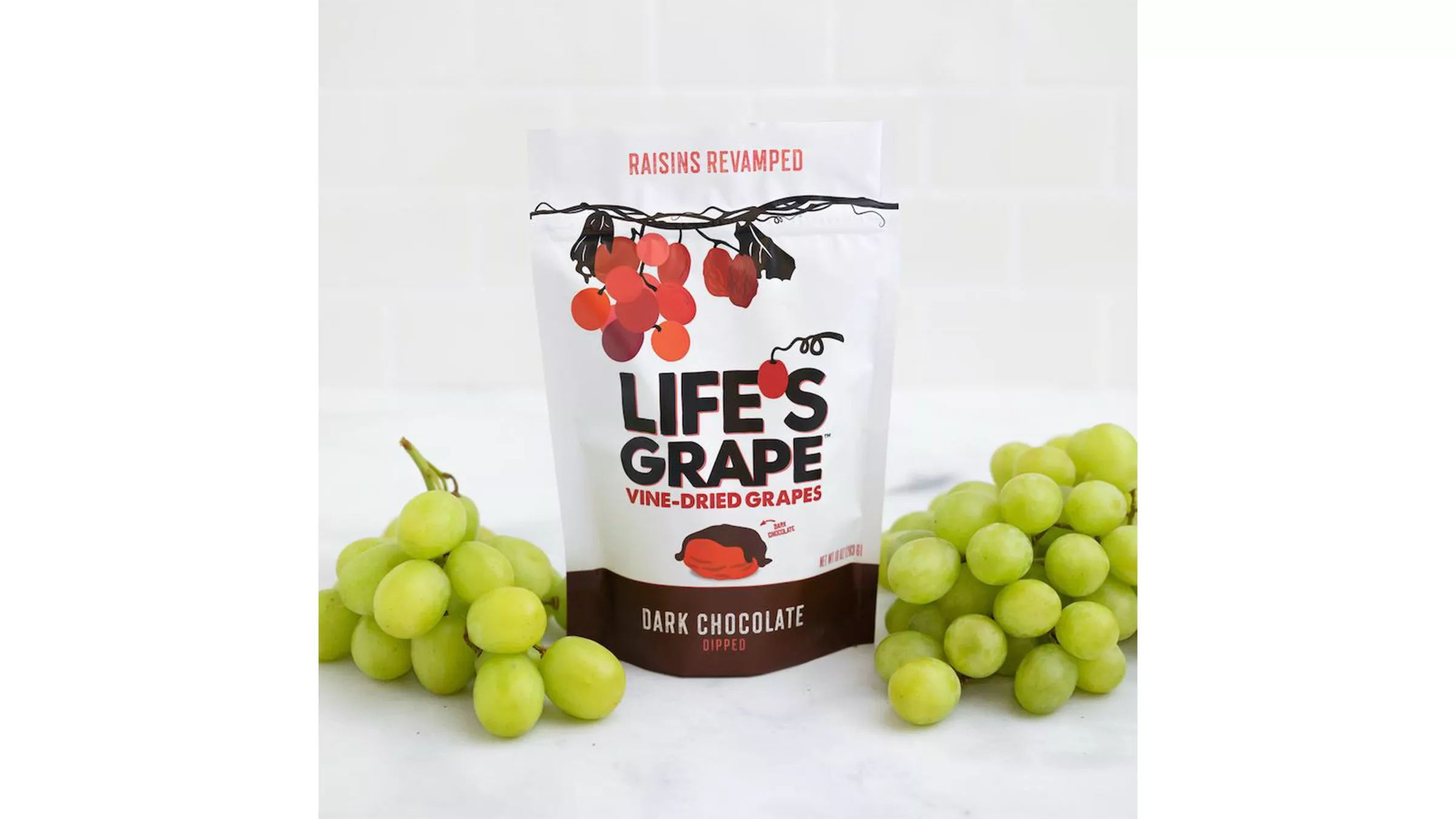 Life’s Grape Dark Chocolate Dipped Vine-Dried Grapes Toma uvas sin azúcar, sumérgelas en chocolate oscuro y espolvorea con cacao en polvo para obtener el máximo sabor saludable y lujoso.