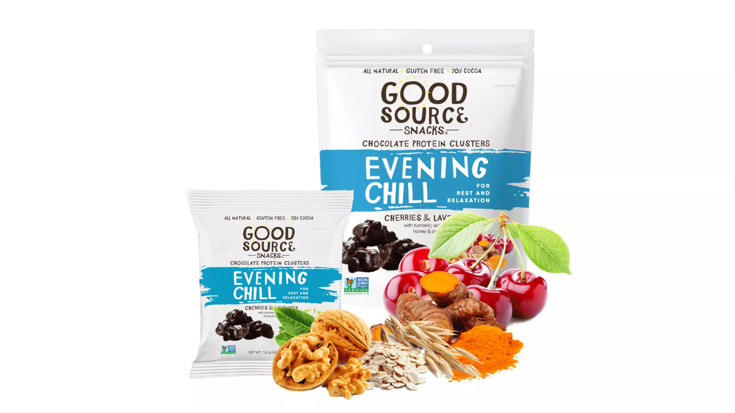 Good Source Evening Chill Chocolate Protein Clusters Estos clusters de nueces y frutas recubiertos de chocolate tienen una ligera esencia de lavanda para ayudarte a relajarte mientras mantienes a raya los antojos.