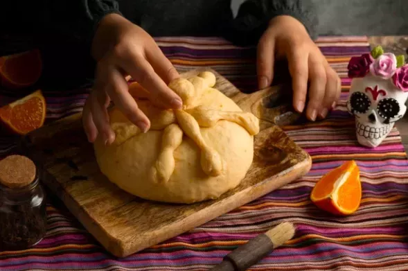 Las familias se reúnen para comer pan de muerto junto con las comidas y bebidas favoritas de sus seres queridos y comparten historias y recuerdos de los miembros de la familia del pasado. El pan de muerto es un pan dulce especial horneado especialmente para la fiesta, con recetas que varían de una región a otra.