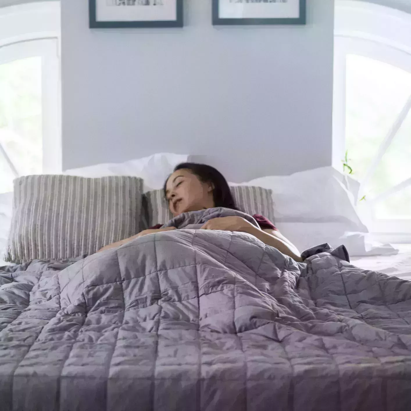 Rellenas de diminutas cuentas de vidrio, arena o plástico, estas mantas parecen edredones o colchas normales, pero se sienten como un firme abrazo. La presión ayuda a aumentar la serotonina (un neurotransmisor que te hace sentir feliz y tranquilo) para que puedas dormir mejor.