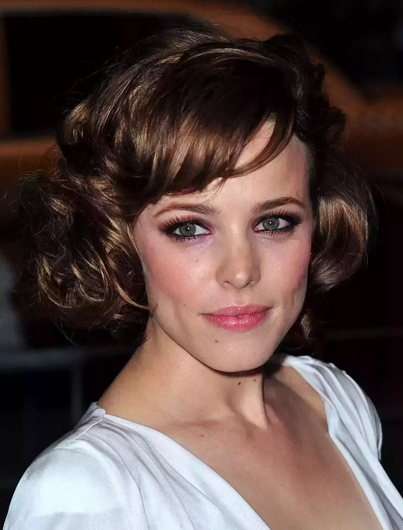 rizado de Rachel McAdamsRachelMcAdams ha sido básicamente capaz de sacar adelante cualquier color y corte de pelo a lo largo de su carrera, clavando sus personajes a la perfección. Aquí la vemos con un bob corto y rizado en un tono castaño bastante espectacular. Súper romántico y retro!