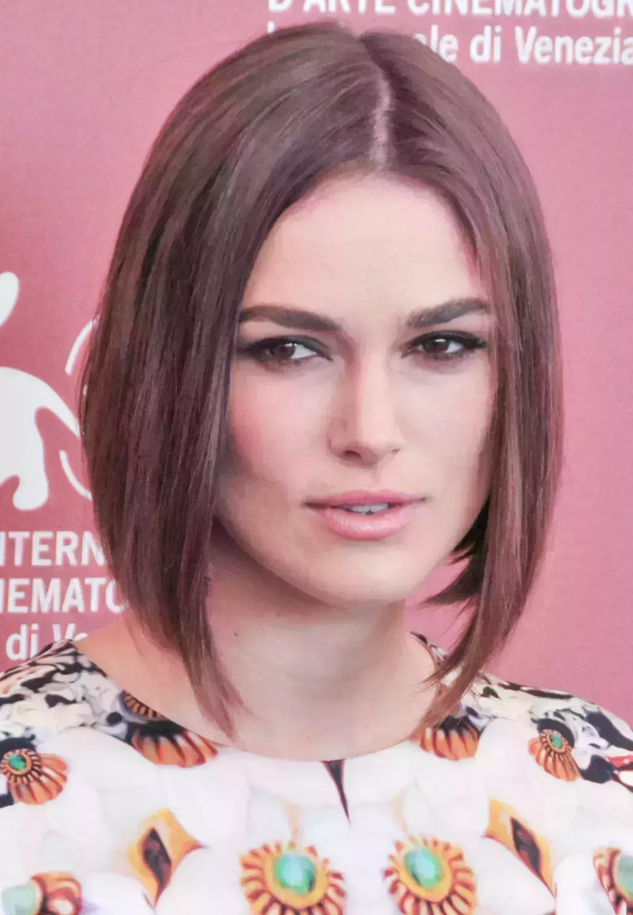 de KeiraKnightly está peinado con el pelo liso que resulta muy favorecedor para acentuar sus rasgos faciales.