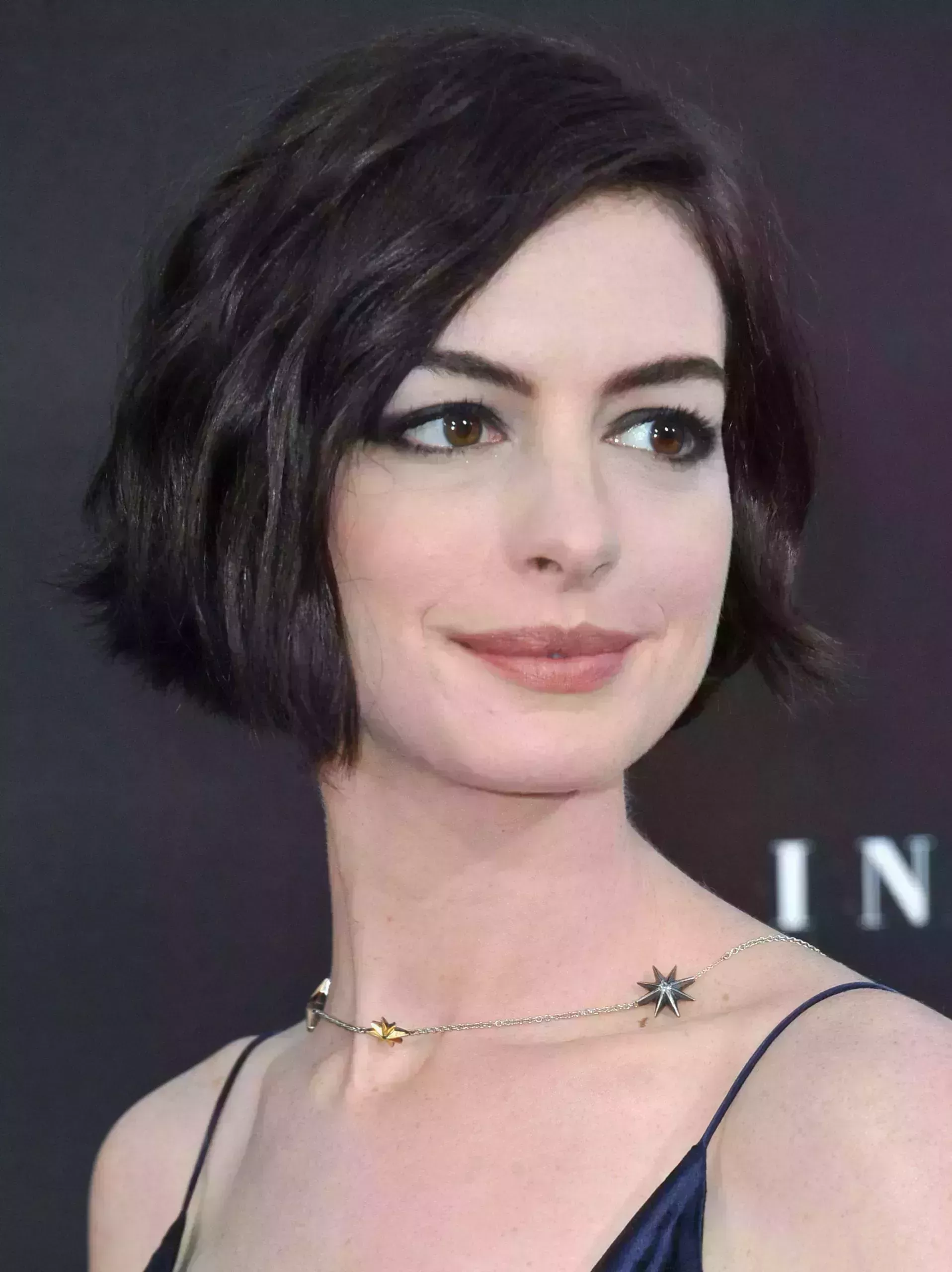 Anne Hathaway Negro Marrón Corto BobUnbob como este, en mi honesta opinión, se ve super lindo en alguien como Anne Hathaway. Sus rasgos faciales son tan delicados y suaves que la contundencia de un bob los resalta de la mejor manera.