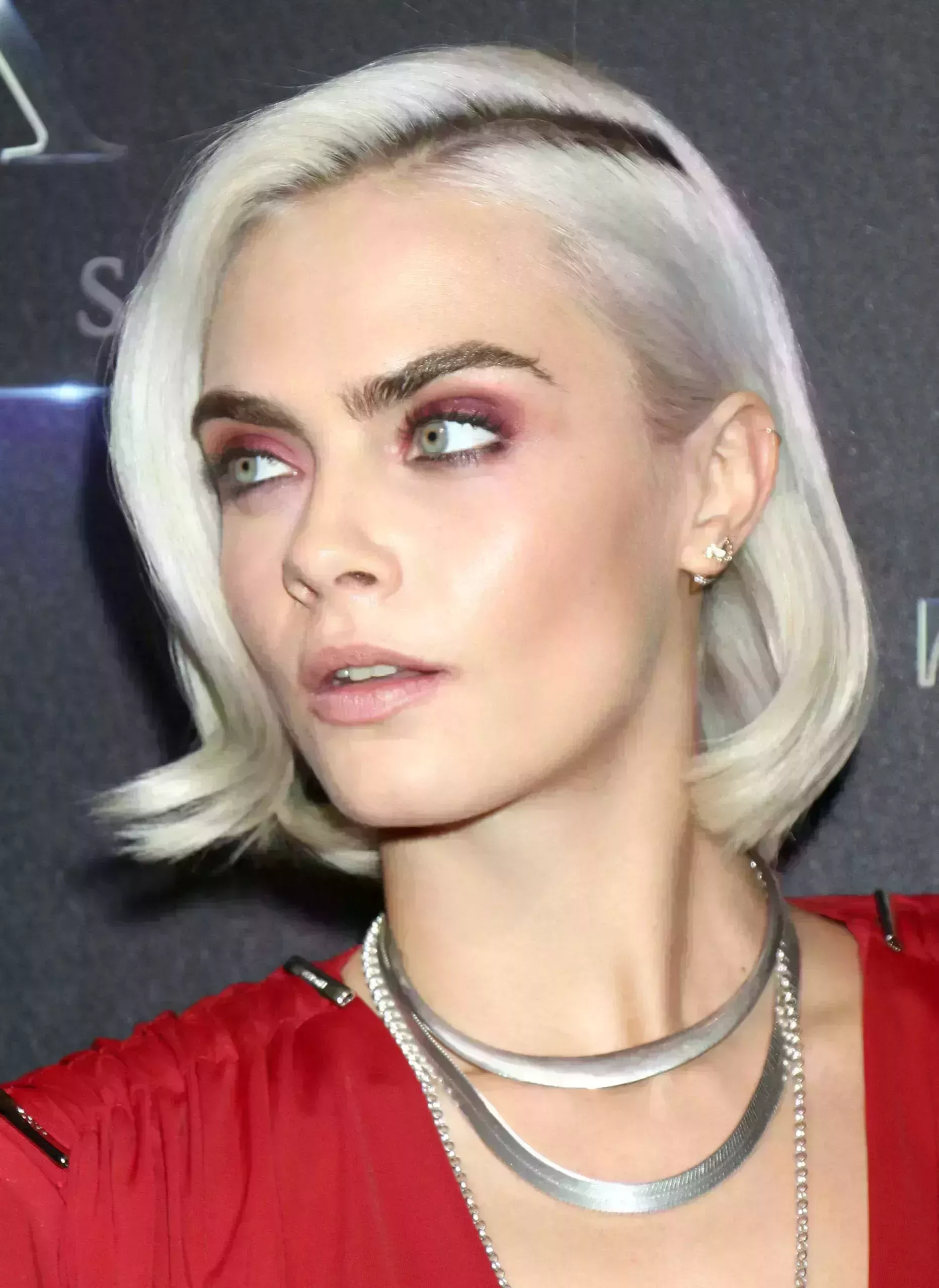 Bob rubio blanco de CaraDelevingneAunque la elección del color del cabello es muy contemporánea al optar por un rubio platino, yo diría que casi blanco, el peinado bob de Cara Delevingne se enmarca en un look muy clásico que incorpora rizos hacia dentro en las puntas y una raya lateral.