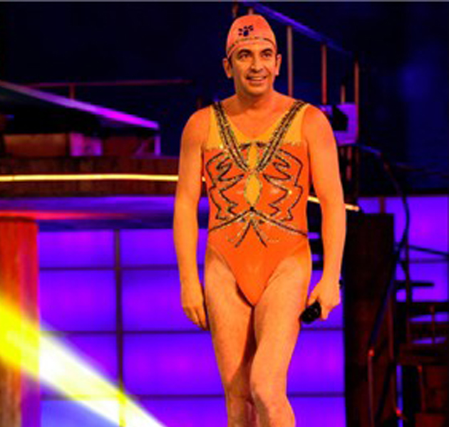 El actor y presentador valenciano comenzó el programa vestido con pantalones y camisa, para pasar, a los pocos minutos, a quedarse con un bañador como el de las nadadoras de natación sincronizada. El problema viene, claro está, porque estas no tienen lo que Arturo entre las piernas, y es imposible que les quede igual el bañador que a él.