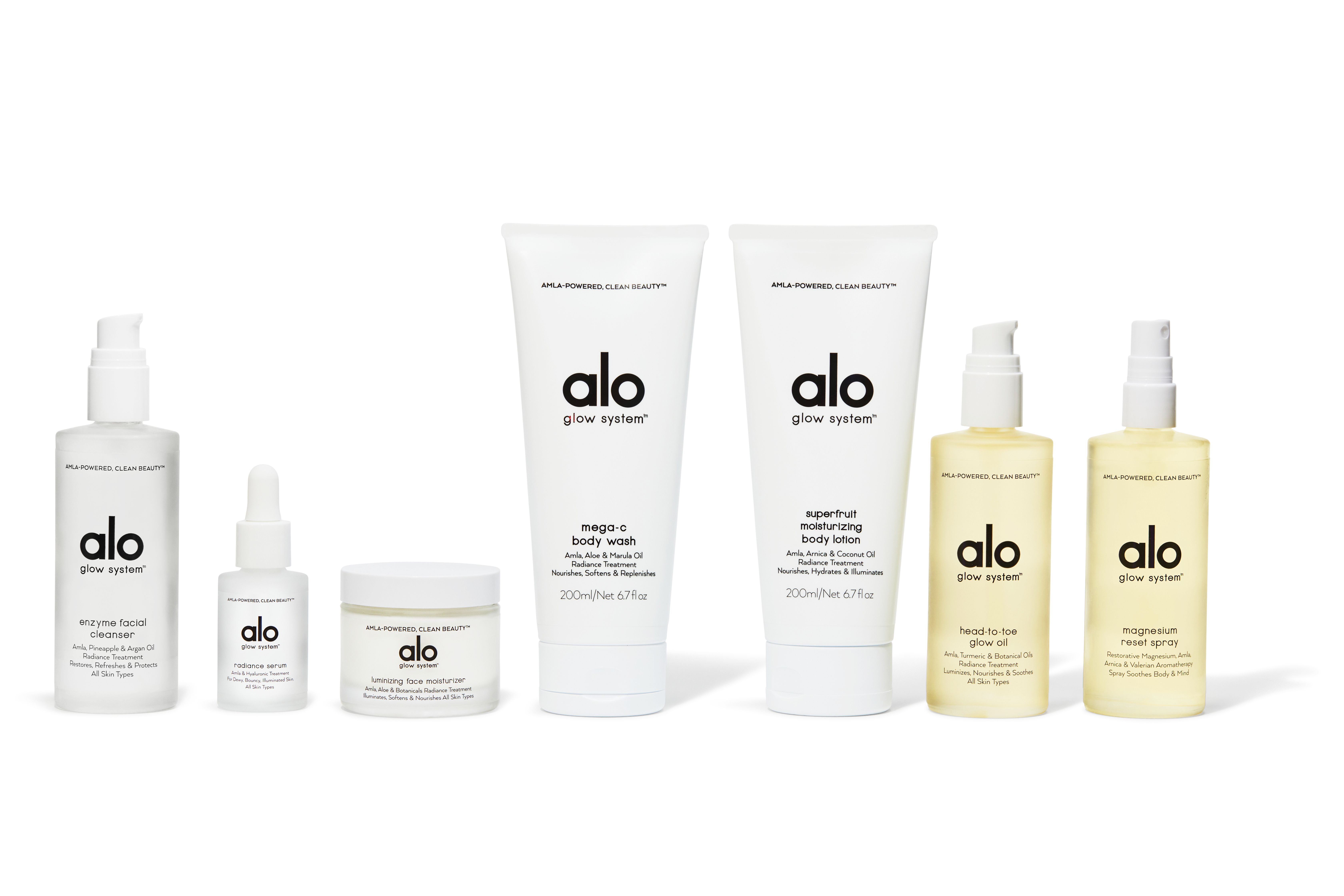 Hoy, 8 de diciembre, Alo lanzó una línea de cuidado de la piel vegana llamada Alo Glow System. La colección, que va de 24 a 88 dólares, incluye siete productos para el rostro y el cuerpo, todos centrados en un ingrediente de súper alimentos popular en el Ayurveda: Amla, alias grosella espinosa india. Es una poderosa fuente de vitamina C, que "es conocida por sus potentes propiedades antioxidantes que ayudan a mejorar las líneas de expresión, a crear colágeno y a emparejar la pigmentación", dice a Women's Health la Dra. Tiffany Libby, dermatóloga de la ciudad de Nueva York. Piense en ello como una protección adicional para su piel, tanto del daño ambiental como de los signos de envejecimiento". "Es esencial para la producción de colágeno, que le da a nuestra piel el soporte y la estructura para combatir las líneas finas y las arrugas", dice la Dra. Libby.