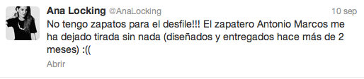 La diseñadora levantó un gran revuelo en Twitter cuando escribió que a día 10 de septiembre aún no tenía el calzado que sus modelos llevarían en su desfile programado dentro de la MBFWM el próximo viernes 13. La diseñadora culpa de este desaguisado al zapatero Antonio Marcos, a quién le entregó los bocetos hace más de dos meses y quien no ha cumplido con los plazos de entrega.