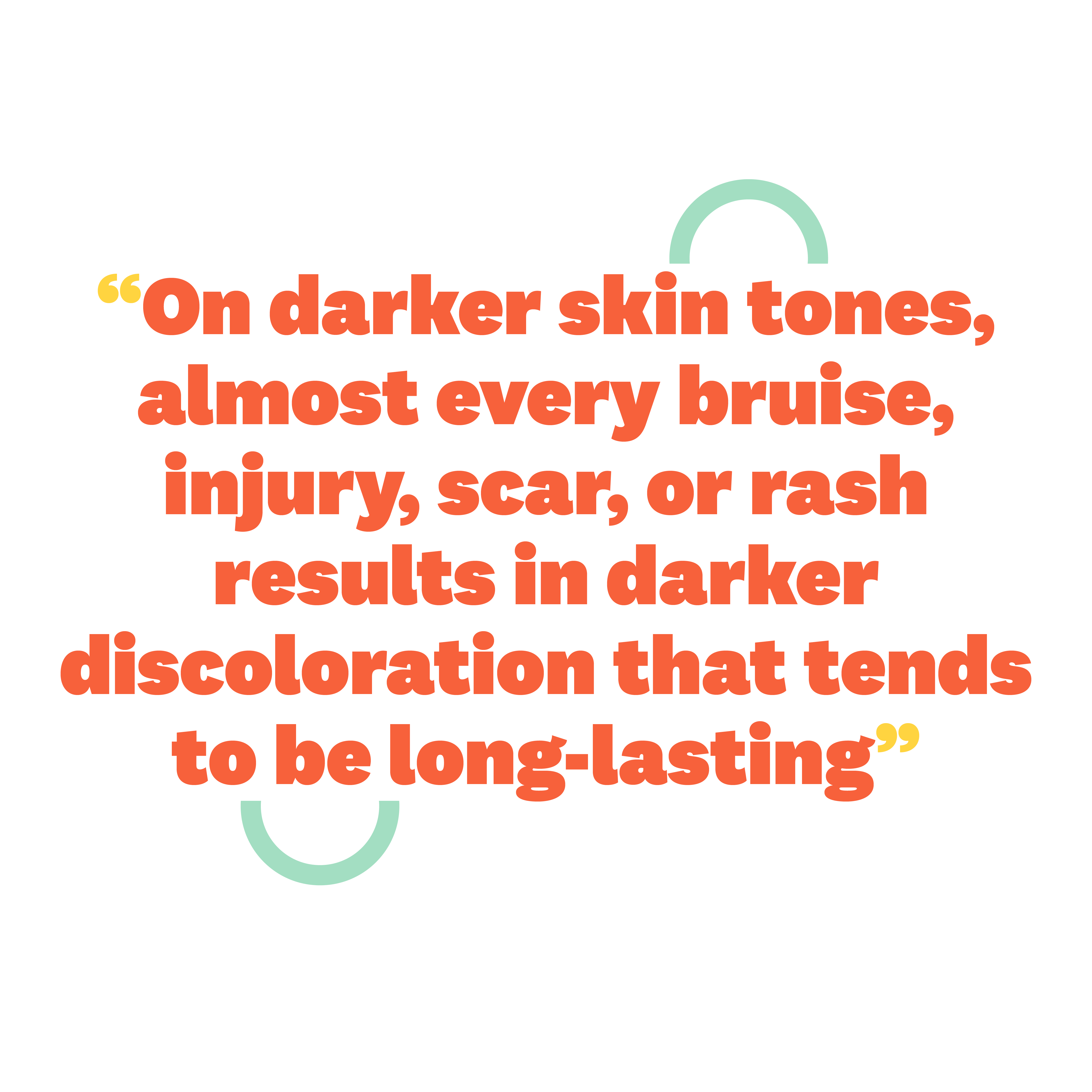 Es increíblemente común en las personas de raza negra y otras personas con tipos de piel más oscuros, dice Johnson. "Casi todos los moretones, lesiones, cicatrices y erupciones provocan una decoloración más oscura que tiende a ser duradera (semanas-meses dependiendo de la gravedad y la ubicación en el cuerpo)".