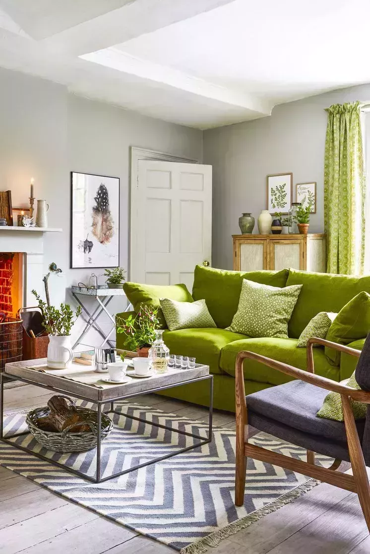 Sorpresa: ¡no hace falta optar por paredes verdes para crear un salón verde! Opta por un sofá de color verde intenso (con cojines verdes), cortinas, obras de arte y macetas con plantas de verdad.