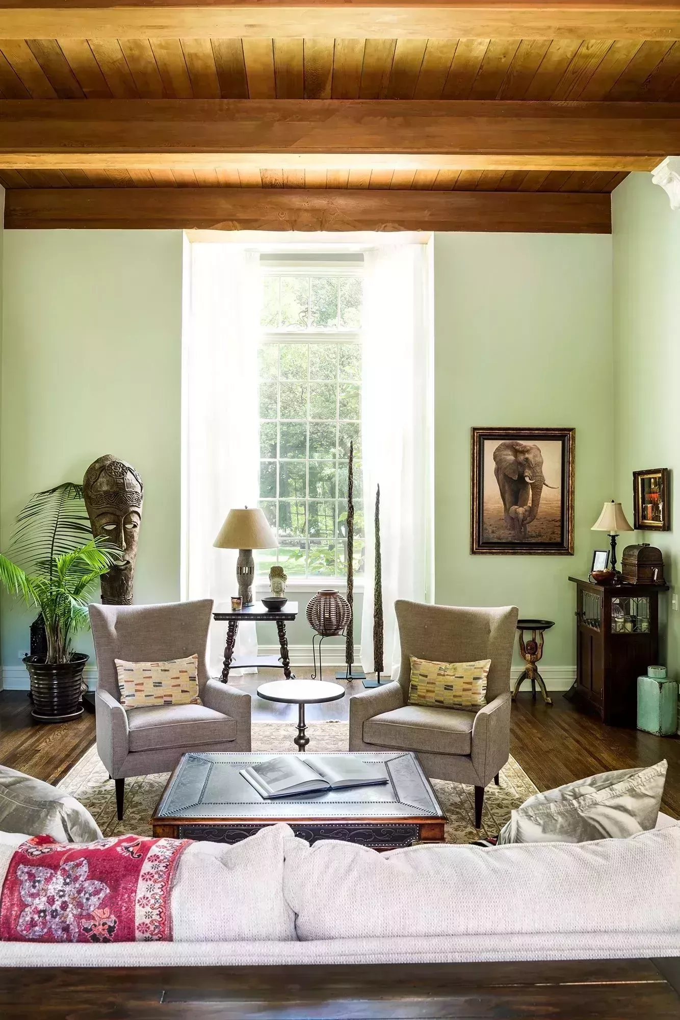 Desde las vigas del techo hasta las obras de arte antiguas y la decoración, todo el espacio se siente terrenal e inspirado en la naturaleza. Las paredes de color verde claro, interrumpidas por una ventana soleada con cortinas transparentes, no hacen más que elevar el ambiente.