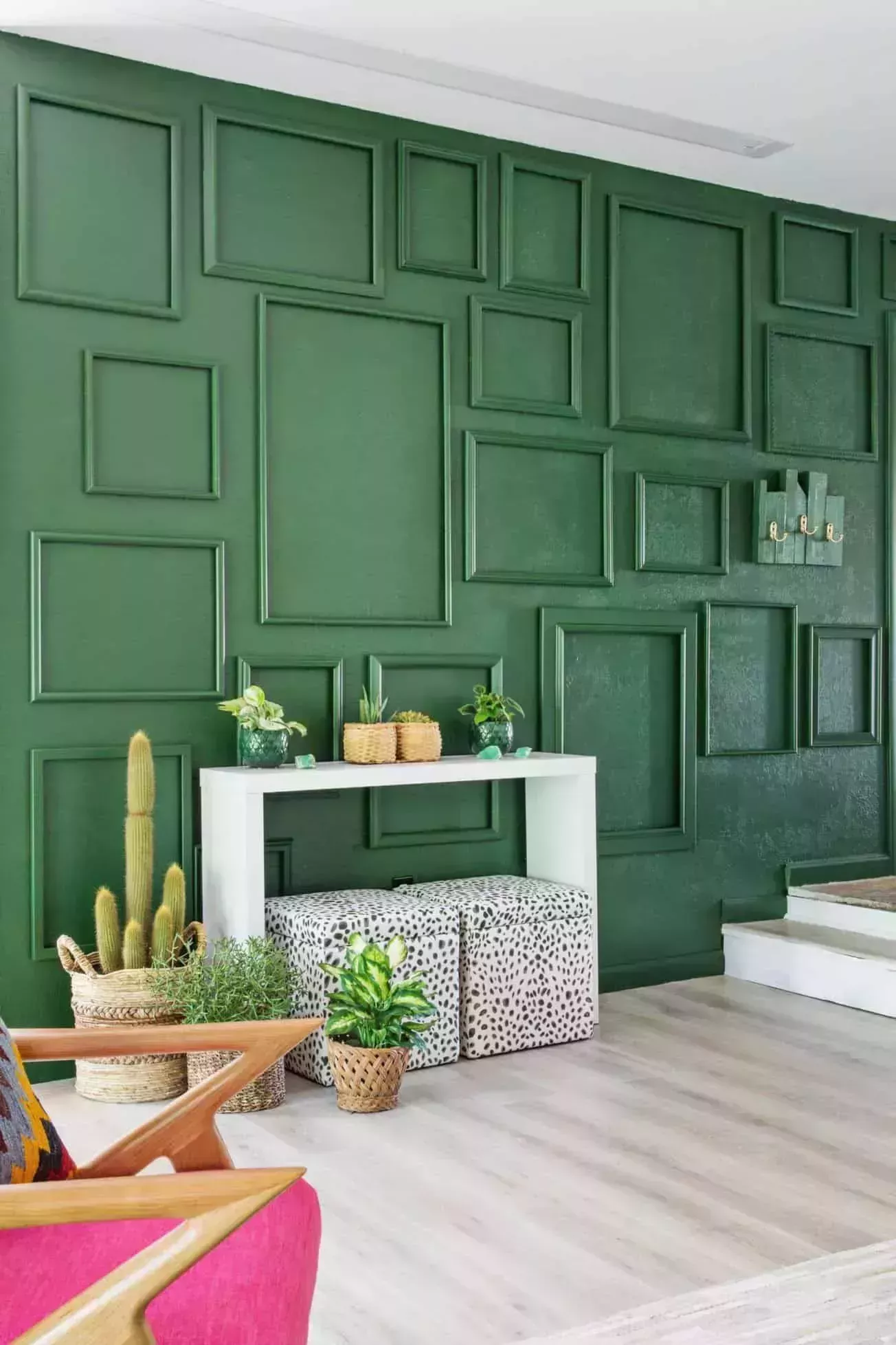 Convierta una simple superficie en una llamativa pared de acento con un color de pintura verde vibrante, (aquí: Acelga de la pintura Behr), pero añada marcos de cuadros antiguos para crear dimensión. ¿Lo mejor? Puedes comprar un montón de marcos viejos en tiendas de segunda mano o de antigüedades para ahorrar dinero.