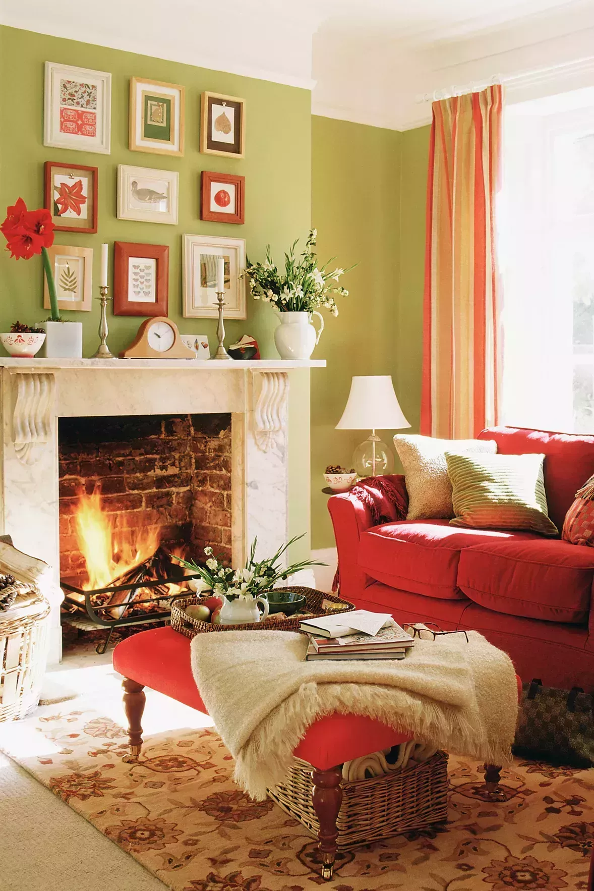 Desde las paredes verdes brillantes hasta el sofá rojo vivo, este acogedor interior es la prueba de que no tiene que ser la temporada de vacaciones para lograr esta combinación de colores única. Ten en cuenta que si optas por dos tonalidades llamativas, puedes añadir capas de colores neutros para atenuarlas, como la manta blanca, la repisa de mármol de la chimenea y la lámpara de cristal de la mesa.