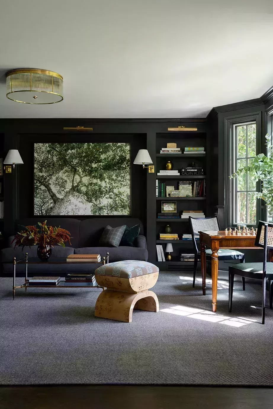 En lugar de optar por un espacio completamente verde, el diseñador de interiores Rob Diaz optó por romper esta sala de estar con paneles de madera. Para que el verde siga causando un gran impacto, se extiende hasta el techo, que también cuenta con elegantes lámparas doradas.