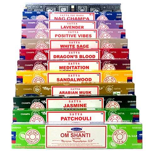 Satya Om Shanti incienso conjunto C 12x15 gramo incluye: Nag Champa, Superhit, Om Shanti, Positive Vibes, Patchouli, White Sage, Sandalwood, Dragons Blood, Meditation, Jasmine, Lavender, Arabian Musk