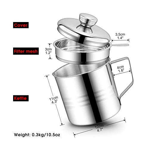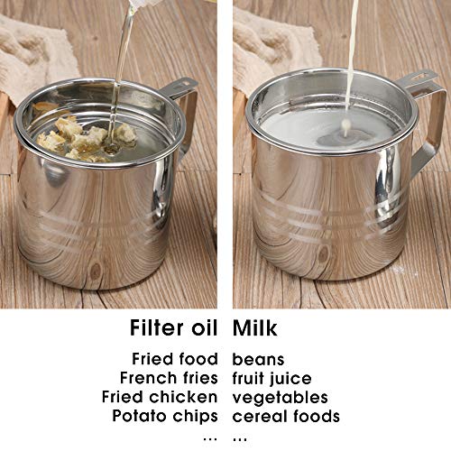 - Ahorre fácilmente aceite usado: Con el colador de malla fina de 0.4 MM, es fácil separar las piezas de comida del aceite de cocina, usted puede verter la grasa caliente en la lata de grasa de cocina inmediatamente para su uso posterior, extremadamente conveniente y práctico.