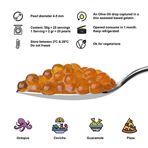 - Perlas de aceite de oliva virgen extra con guindilla de máxima calidad, esferas con el interior líquido que estallan en la boca cuando muerdes