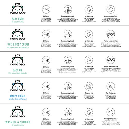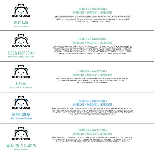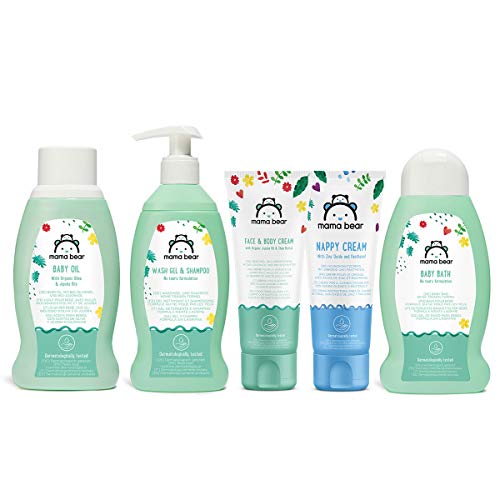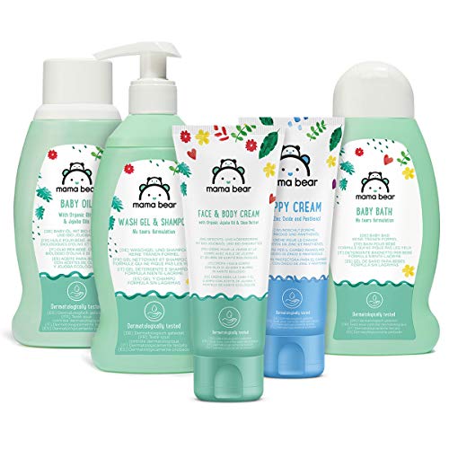 Marca Amazon- Mama Bear Set para los bebés: Gel de baño, champú, crema para el cambio del pañal, aceite, crema para la cara y el cuerpo