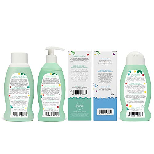 - Inc.: 1 x Gel de baño; 1 x Gel y champú; 1 x Crema protectora para cambio del pañal con óxido de zinc y pantenol; 1 x Aceite( con aceites de oliva y jojoba ecológico); 1 x crema (cara y cuerpo)