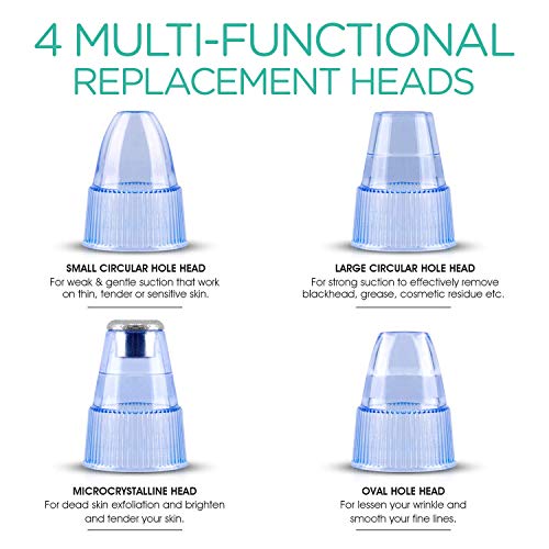 - ✔ 4 CABEZAS FUNCIONALES INCLUIDAS - Incluyendo 1 x Cabeza de orificio circular grande para una fuerte succión, 1 x Cabeza de orificio circular pequeña con suave succión para el área sensible de la piel, 1 x Cabeza de orificio ovalada para una mejor remoción de la cabeza de la nariz, 1 x Cabeza microcristalina para exfoliación de piel muerta .