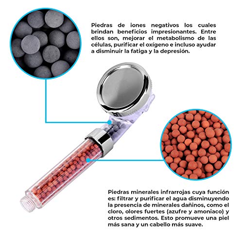 - 【Filtración】: El cabezal de ducha Vis Evolutio filtra el agua mediante dos tipos de piedras. Ideal para mejorar la suavidad de la piel y el cabello. Los iones negativos ayudan con la fatiga y la depresión. La alcachofa de ducha ayuda a eliminar el cloro, la cal, toxinas, metales pesados, bacterias, pesticidas, óxido y olores del agua de la ducha. Viene incluido un repuesto gratuito de piedras minerales e iones negativos para reemplazarlas cuando se vayan desgastando.