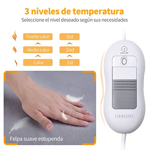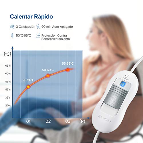 - CALENTAR RÁPIDO & PROTECCIÓN SOBRECALENTAMIENTO: La manta electrica se calenta rápidamente, lo que acelera efectivamente el alivio del dolor de cervicales y de lumbalgias; Los 3 ajustes de temperatura de 45°C a 65°C le permiten seleccionar el calor deseado para diferentes necesidades; La protección de sobrecalentamiento: 90min auto-apagado de seguridad ayuda a ahorrar energía y evita el calentamiento excesivo, le garantiza un sueño seguro y cómodo.