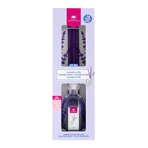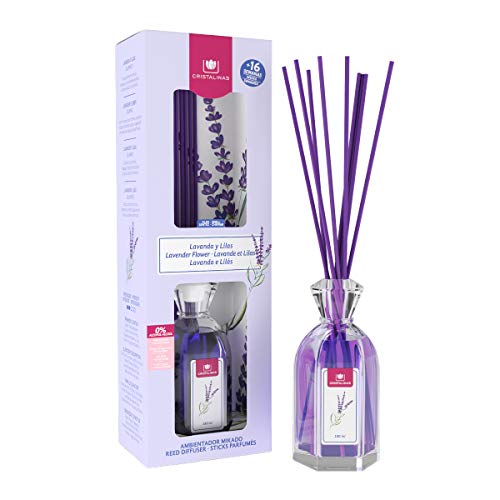 CRISTALINAS. Ambientador Mikado Clásico. Difusor con Varillas de ratán. Formula sin Alcohol. Máxima duración, más de 16 semanas. 180ml de Capacidad. Aroma Lavanda y Lilas