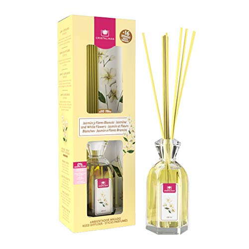 CRISTALINAS. Ambientador Mikado Clásico. Difusor con Varillas de ratán. Formula sin Alcohol. Máxima duración, más de 16 semanas. 180ml de Capacidad. Aroma Jazmín y Flores Blancas