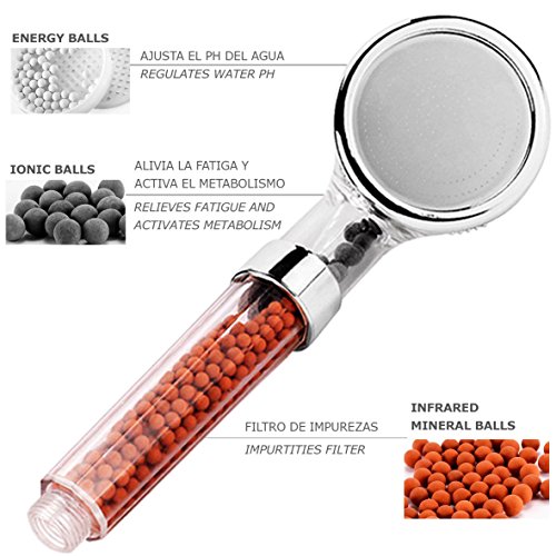 - PURIFICA EL AGUA; la filtración por medio de las perlas de iones y infrarojos permite eliminar hasta en un 80% las impurezas que transporta el agua de suministro, mejorando así el cuidado de la piel y cabello