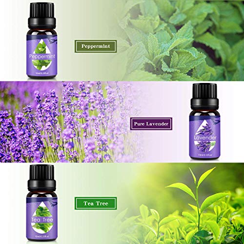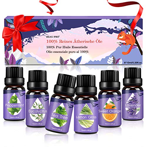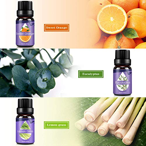 Set de aceites esenciales,100% Natural Puro Aromaterapia Aceite Aromático,6 x 10 ml (Lavanda, Hierba de Limón, Menta, Eucalipto, Árbol de té, Naranja dulce) para Humidificador y Difusor Aroma