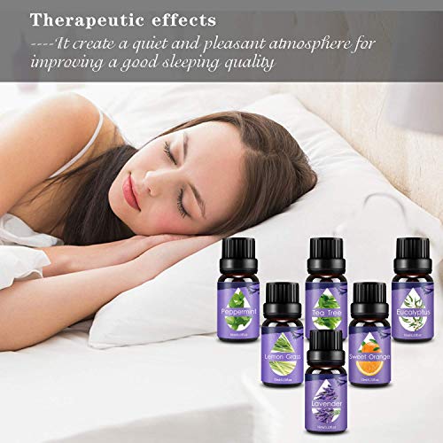 - ?6 Aceites Esenciales Naturales: con este conjunto TOP 6 tienes todos los aromas que necesitas para los momentos místicos. El conjunto se compone de aceites terapéuticos de aceite Aromaterapia de lavanda, aceite de árbol de té, eucalipto, menta, naranja dulce y hierba de limón. Las botellas de 10 ml y nuestras botellas oscuras ayudan a mantener el aceite fresco y evitan que se degrade fácilmente.