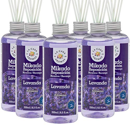 La Casa de los Aromas, Set de 6 x 250ml Ambientadores Mikado Lavanda para Reposición con Varillas, Difusor Líquido de Aroma Lavanda, Perfume Duradero para el Hogar, Baño, Casa - 6x250 ml