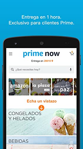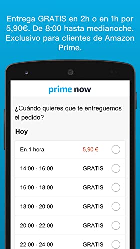 - Con la App Amazon Prime Now, recibirás tus pedidos GRATIS en 2 horas o en 1 hora por 5,90€, eligiendo entre miles de productos: alimentación y bebida, droguería y belleza, electrónica, juguetes y mucho más. Entregas disponibles desde las 8:00 de la mañana hasta medianoche.